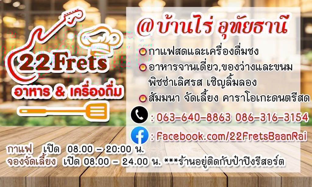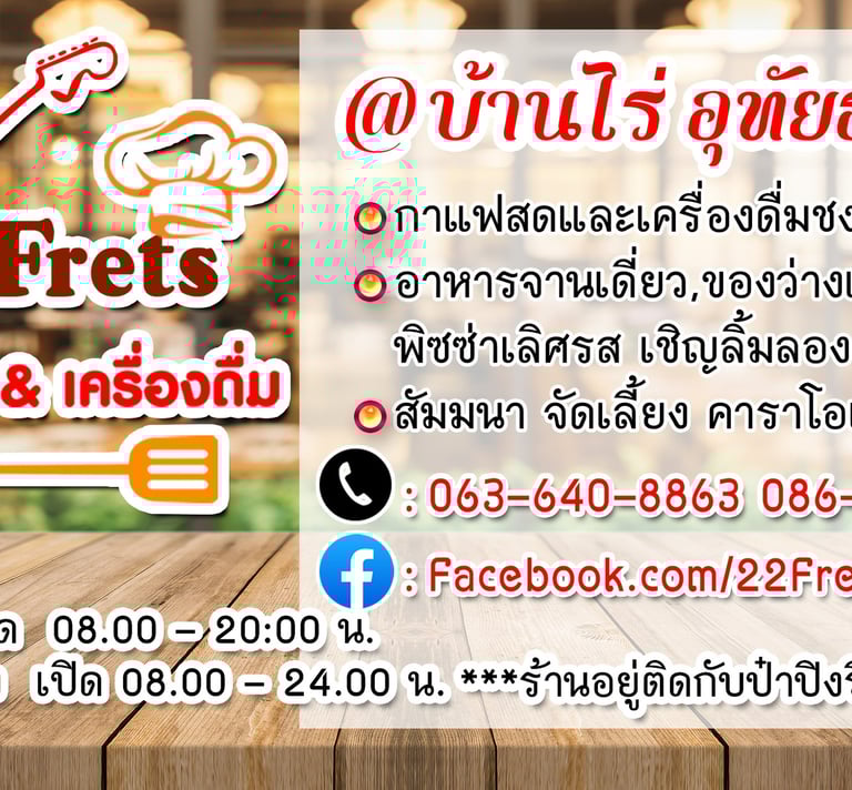 22fretscafe is a pizzeria, coffee shop, and restaurant located in Baanrai Uthaithani, Thailand. We offer a wide range of delicious pizzas, coffee drinks, authentic Thai foods, and more. With fast food options, liquors, live music, and karaoke, we provide a vibrant and entertaining dining experience for our customers.